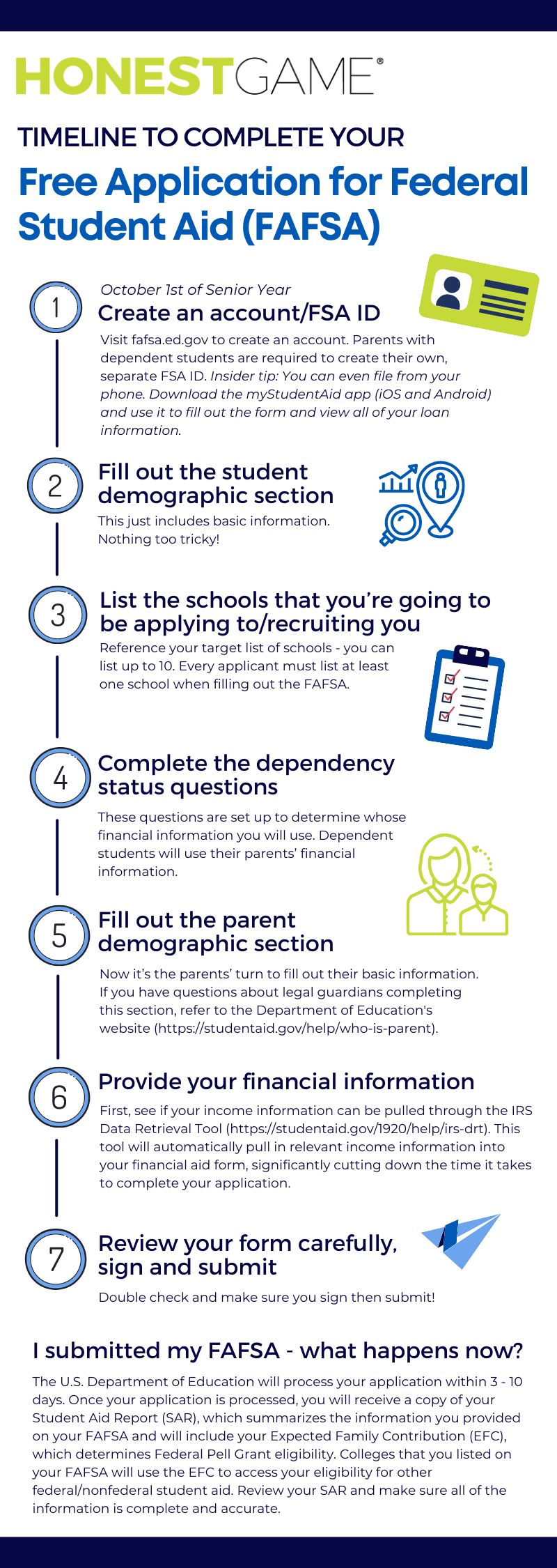 Even if you don’t think you’ll qualify for federal aid, you should still apply. Most colleges and many private scholarships require students to submit their FAFSA to be considered for financial aid. Some colleges will even evaluate your FAFSA to determine which other kinds of scholarships, like merit-based scholarships, you could qualify for. Plus, a college (and college coach) may take your application more seriously when you’ve submitted a FAFSA.