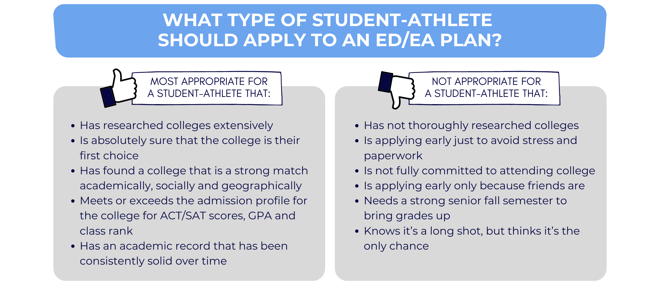 College admissions for student-athletes is a confusing and demanding process, and can require a solid understanding and hours of preparation. Beyond the regular admissions process, two increasingly popular options to consider are early decision (ED) and early action (EA).